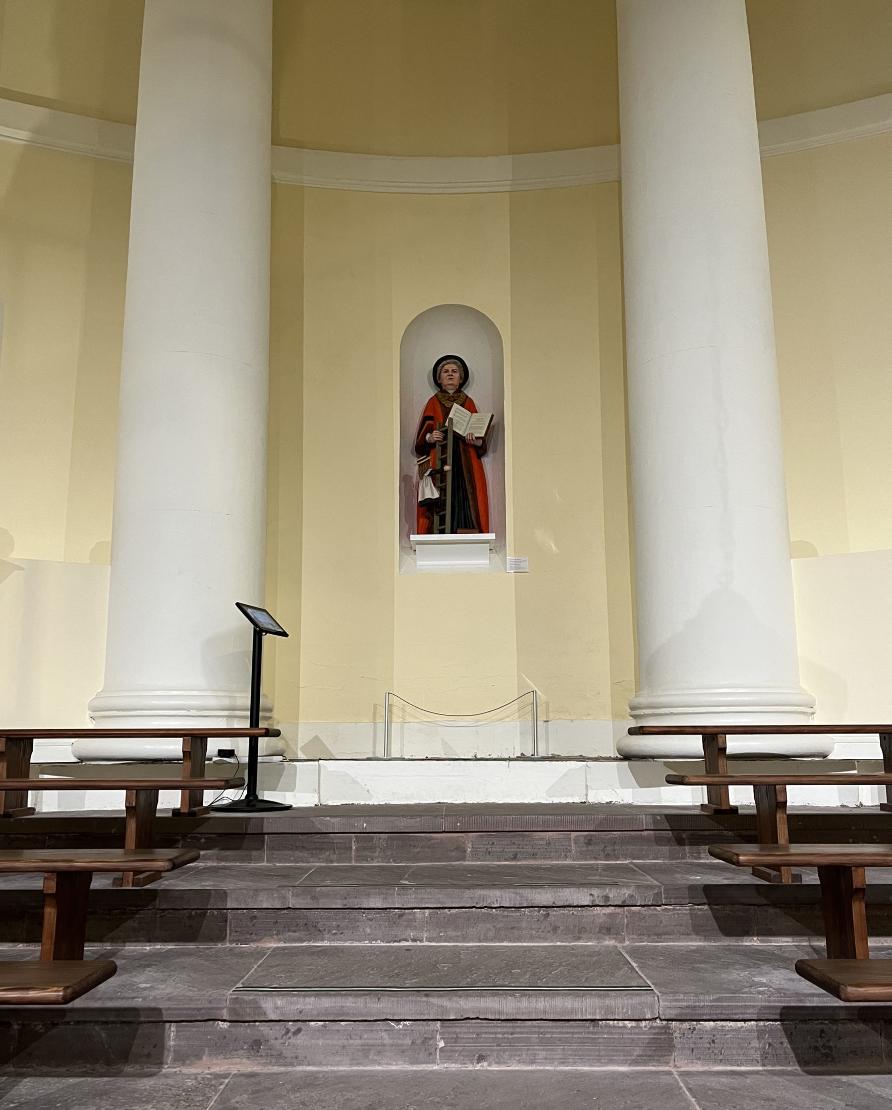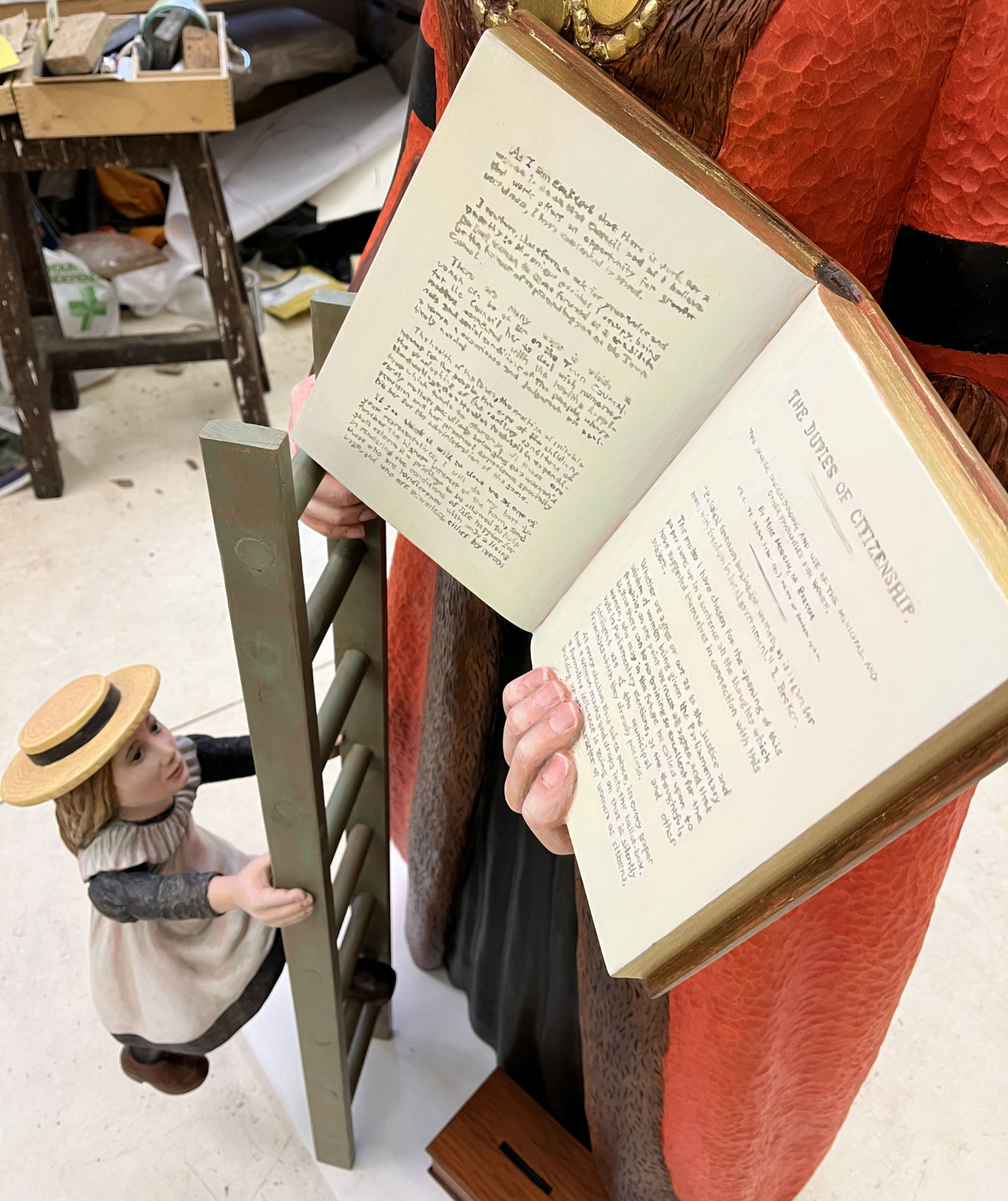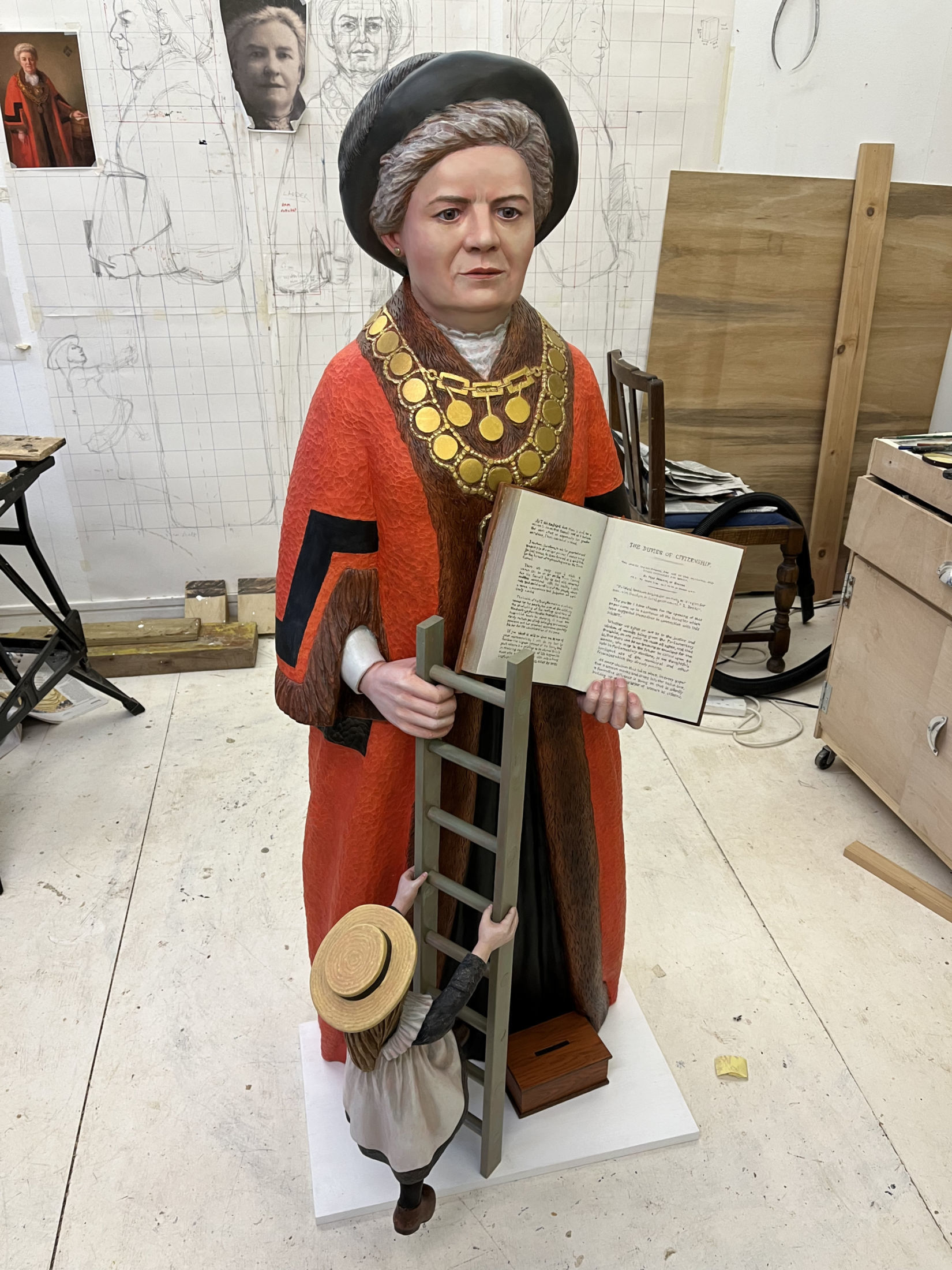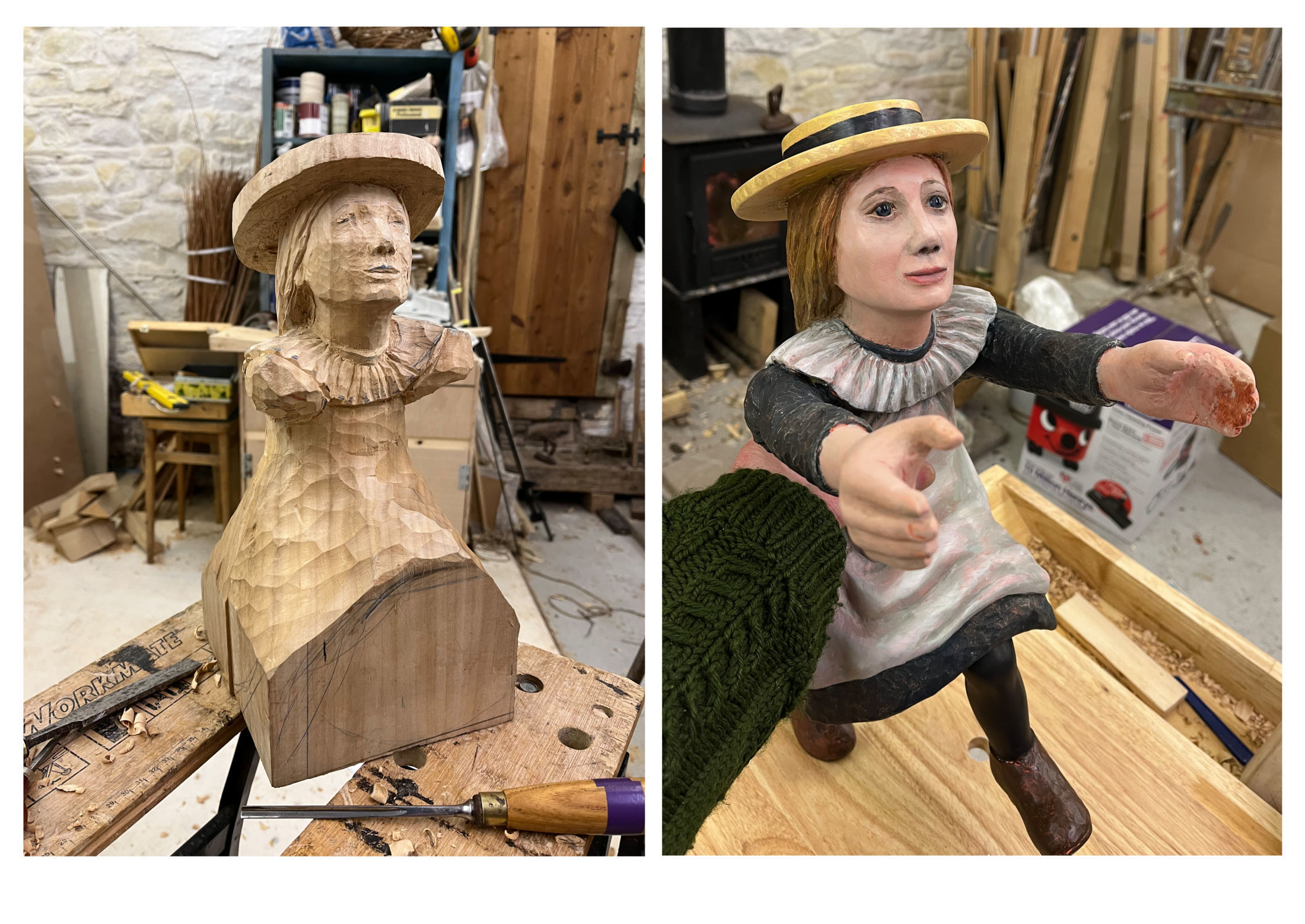 Polychromed carved wood, 140cm high, sculpture about Gwenllian Morgan, 1st female mayor in Wales, commissioned by Brecon Story Network